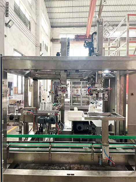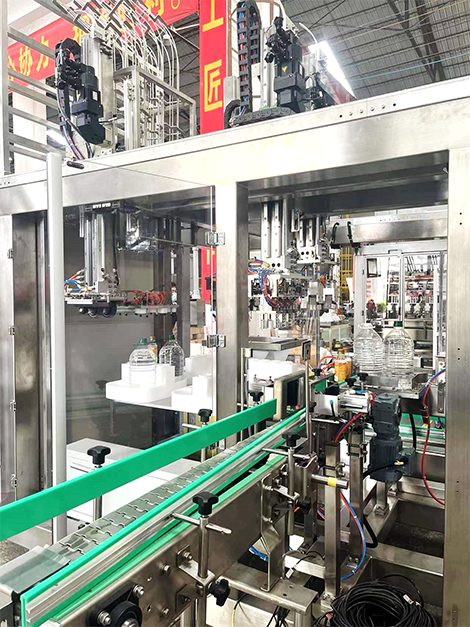 华信电机配合某设备有限公司在广州的桶装油/桶装水包装生产线,该生产线主要完成输送、分拣、贴标、装箱。在输送盘上有四个工位,传送过来物料桶在转台上分别装入四个卡位,再由机械臂抓起放入下一步灌装,灌装后再由机械臂抓取放入下一工位旋盖、贴标、运走装箱。