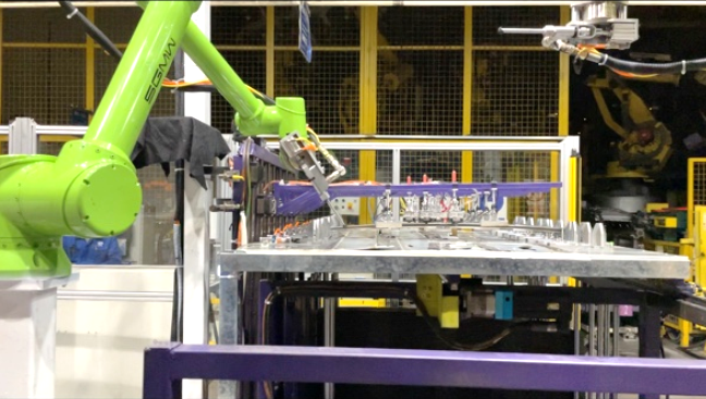 应用中,汽车车身工艺流程要求在钣金件成型之后、没有喷漆之前,运用特殊工装在车身钣金件上涂抹NVH抗躁胶,并配合搬运工序以及焊接工序的机器人形成车身零部件加工生产线。在生产线布局十分紧凑的车身车间里,与其他大型机器人协同作业完成喷涂工艺。