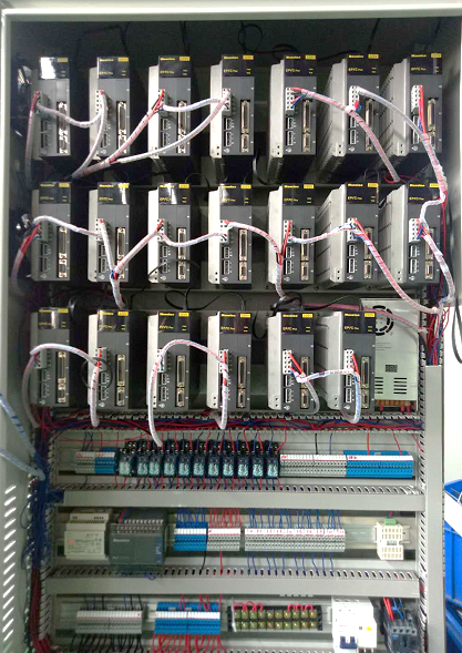 在电机生产过程中,出厂拷机测试是一个很重要的环节,能够发现电机存在的问题,工厂之前采用的拷机方式是手动按驱动器调,拷机完成后再手动检查零点,驱动器摆放很乱经常出现故障,大量线缆裸露在外面不是很安全,现在为了操作简单,安全,快速,使用PLC来进行逻辑控制,在触摸屏上直接操作。通过各种功能码将复杂的运动控制用功能指令来完成,让被测电机快速达到额定转速反复切换运行方向,严格监测电机的各项性能指标,在复杂多变的电气环境中采用终端匹配的总线型结构,实现了平衡传输,多点通讯很好的抑制了共模干扰,全参数化的设计让测试步骤变得简单易行,电机的电流、转矩、速度、温升等等关键数据能够精准获取。